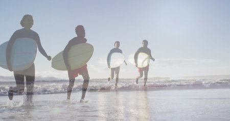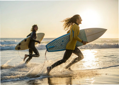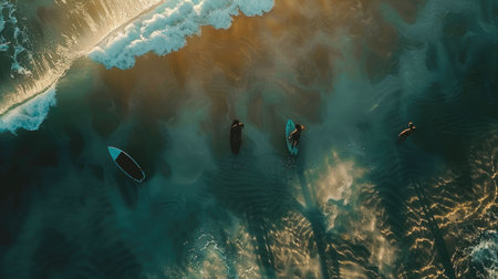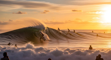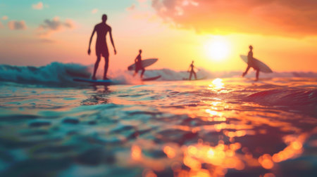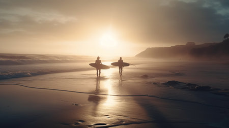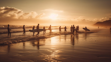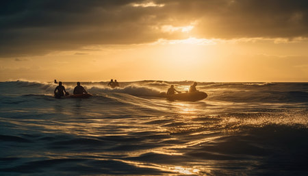 Sun kissed surfers ride waves at dawn, enjoying summer vacations generated by artificial intelligence