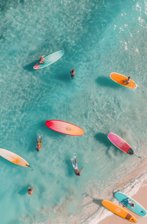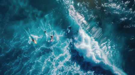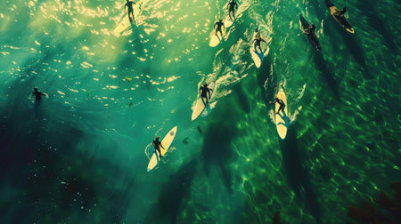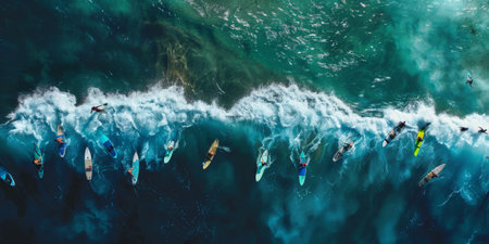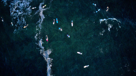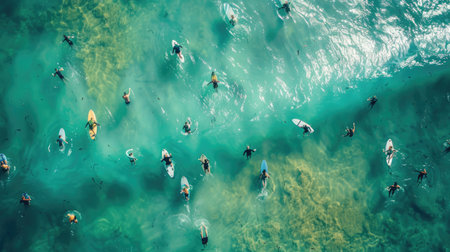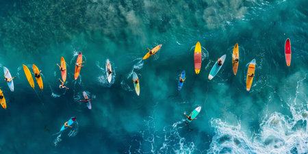 Aerial shot of diverse surfers floating on colorful boards, awaiting the perfect wave.