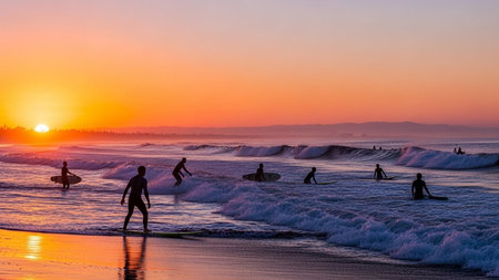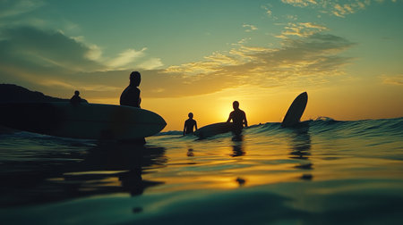 Depict a group of surfers awaiting the perfect wave, their silhouettes set against a backdrop of a vibrant sunset, highlighting the anticipation and camaraderie of the sport.