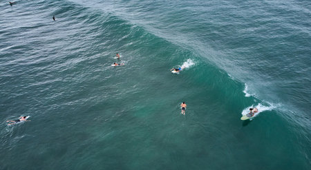 Aerial view of surfers waiting, paddling and enjoying waves before sunset time. Del Mar Beach, California, USA