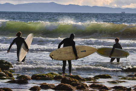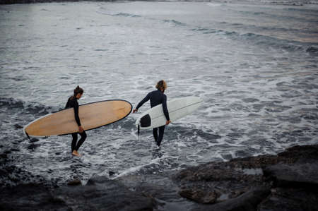 Back view of surfers in wetsuit with his surfboards entering out of sea after surfing on waves