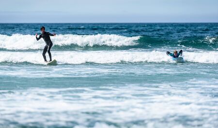 Young couple surfing with surfboard on waves in Atlantic ocean. Husband and wife or boyfriend and girlfriend are actively surfing the waves of cold atlantic ocean in Galicia, Spain.