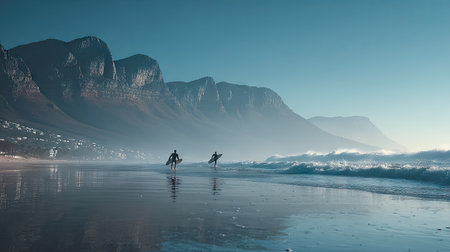 Two figures carry surfboards along a reflective beach surface with a backdrop of a majestic mountain range. The scene is bathed in a cool, calming color palette, suggesting either early morning or late afternoon light. The image may be suitable for travel, adventure, or lifestyle editorial and commercial applications.