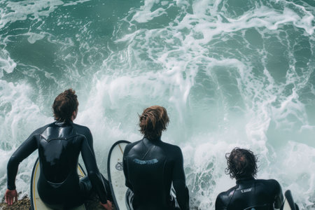 Three individuals wearing wetsuits are seated on a rock that is situated by the ocean, Surfers in wetsuits waiting patiently for the perfect wave, AI Generated