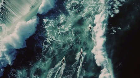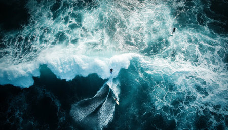 Surfers catch and ride the crest of a wave, showcasing exciting ocean action from above.
