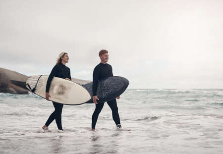 To become a good surfer, you need to understand the ocean. a young couple out at the beach with their surfboards.