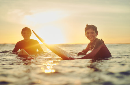 Good vibes happen on the tides. Portrait of two young brothers sitting on their surfboards in the ocean.