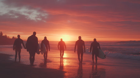 A group of surfers walks along the beach at sunset, creating a striking silhouette against the vibrant sky. The scene captures the essence of adventure and outdoor lifestyle.