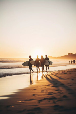 Sunset session: silhouettes of surfers carrying boards on the beach at sunset, ready for a session in the water. generative ai