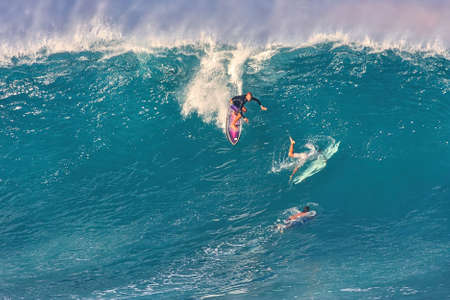Surfing giant waves at Pipeline on the north shore Oahu Hawaii