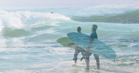 Diverse couple holding surfboards, walking into ocean waves. Both wearing wetsuits, preparing for surfing session
