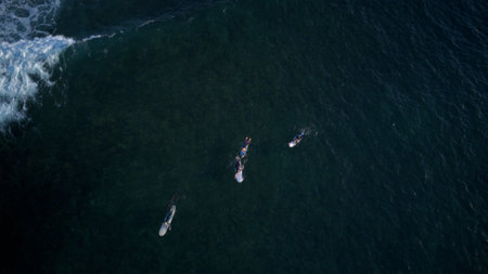 An aerial shot of surfers swimming laying on their boards in the sea waiting for strong waves to come