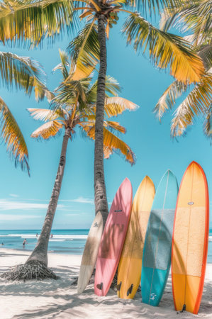 Brightly colored surfboards leaning against a palm tree on the beach, with turquoise ocean in the background