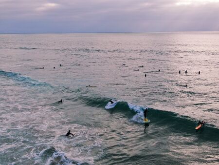 Aerial view of surfers waiting, paddling and enjoying waves before sunset time. Del Mar Beach, California, USA
