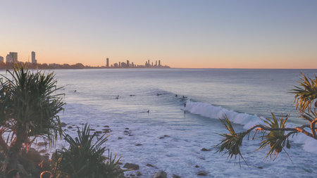 Surfers Paradise, Australia on August 16, 2016: Surfers enjoying the waves at snapper rocks with the skyline of Surfers paradise in the background