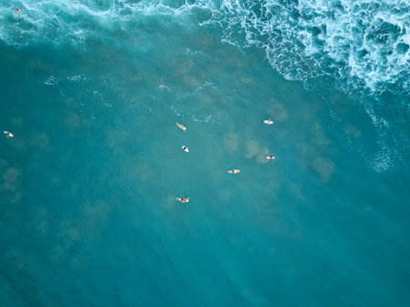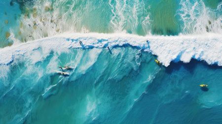 Aerial view of surfers skillfully riding magnificent waves in a vibrant ocean landscape