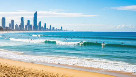 Surfers catching waves in Surfers Paradise on the Gold Coast, QLD, Australia