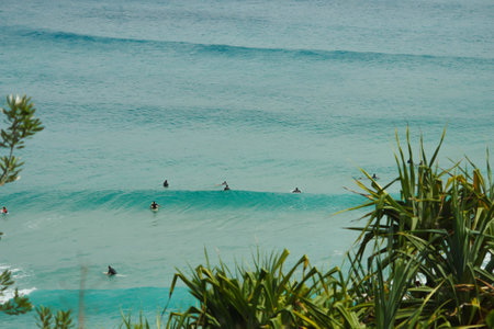 a wide angle shot of surfers riding waves on a winter's afternoon at burleigh heads in queensland