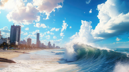 Experience the unstoppable energy of ocean waves crashing onto a sandy beach, framed by a stunning city skyline and vibrant clouds under a bright sky.