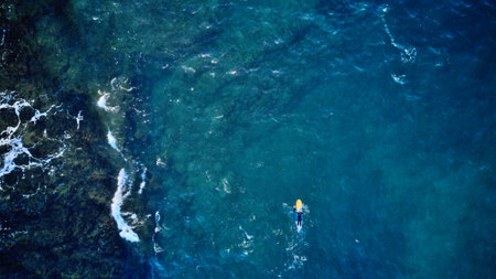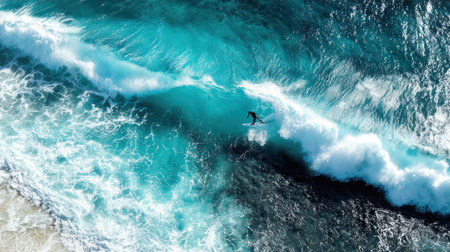 An overhead perspective reveals a surfer riding a large wave in the vast ocean. The water exhibits shades of blue and turquoise, with white foam. The composition showcases the natural environment with dynamic lines and textures, suitable for various editorial and commercial applications.