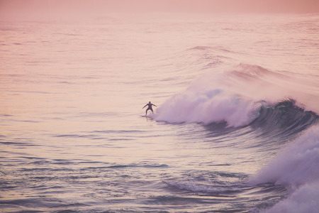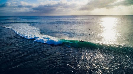 Surfing big wave at sunset in Bali island, Indonesia.