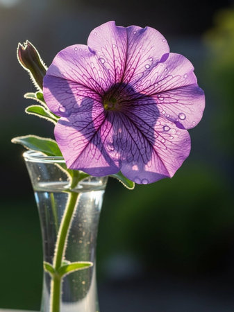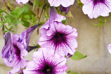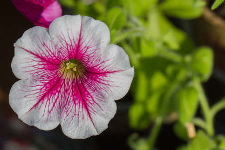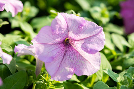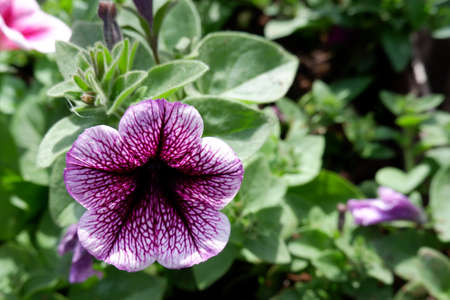 Vivid petunia garden flower growing. Petunia flower in nature. Summer nature. Vivid inflorescences of flowering plant. Flower of petunia. Flowering background. Petunia blossom. Blooming petals