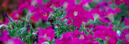 petunia flowers close-up on a green background with a blurred focus. Petunias with selective focus horizontal background with space to copy. nature wallpaper