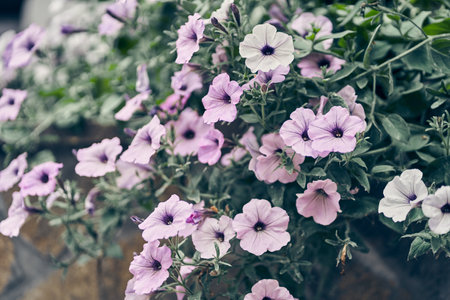 Flowering background. Petunia blossom. Vivid petunia garden flower growing. Petunia flower in nature. Summer nature. Vivid inflorescences of flowering plant. Flower of petunia. Garden blooms