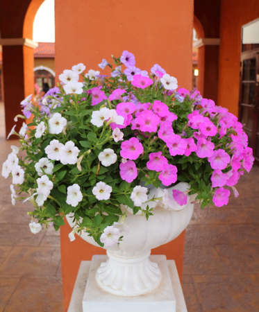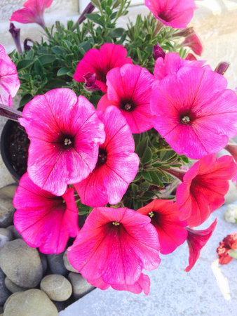 Colorful petunia flowers in vibrant pink and purple colors in decorative flower pot close up, floral wallpaper background with blooming petunias