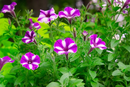 Summer nature. Vivid inflorescences of flowering plant. Flower of petunia. Flowering background. Freshness of nature. Petunia blossom. Vivid petunia garden flower growing. Petunia flower in nature