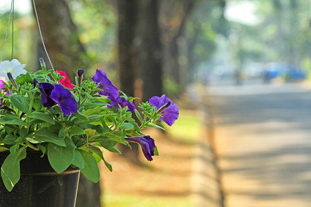 multi-colored petunias in pots on a summer sunny day on the street with a large plan