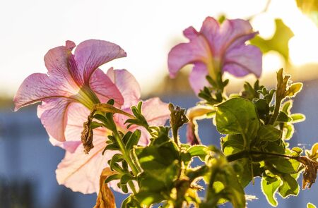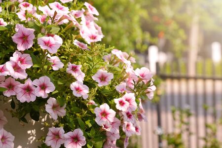 Beautiful pink colored petunias flowers with sunlight in the garden. Petunia flowers in the garden. Petunias wave.