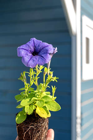 petunia seedling with a lilac or blue flower in the hands of a gardener with shadows, a close-up photo with selective soft focus.