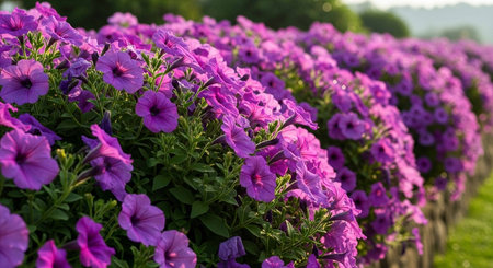 Floral background, blooming colorful lush petunia bushes on a flower bed, sunny day