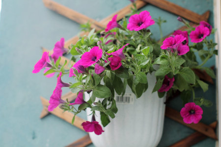 Pink petunia flowers in a decorative flower pot close-up, flower wallpaper background with blooming petunias. High quality photo