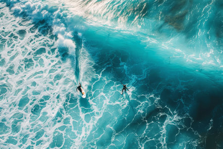 Generative AI : Aerial view of people with a surfboard in the Ocean waters Australia