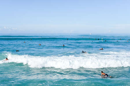 Beautiful blue Pacific Ocean view and many surfers waiting for waves in Waikiki Beach Honolulu, Oahu island, Hawaii.