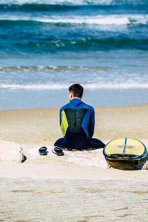 Hossegor, FRANCE - 08.07.2021: Surfer in the Atlantic Ocean. The coast of Hossegor, FRANCE. High quality photo