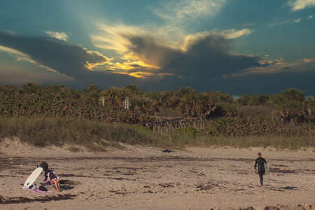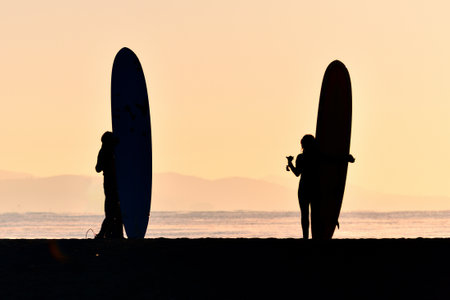 Sunset on the Pacific Coast in California, surfer and joggers run a sport