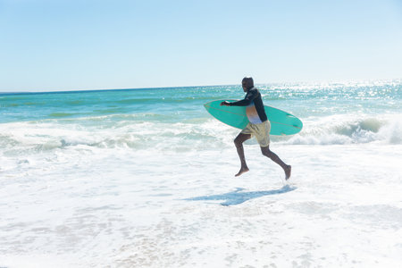 African American man carrying turquoise surfboard while walking on sunlit beach, copy space. Ocean, shoreline, leisure, coastal, athletic, vibrant, adventure