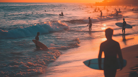 A tranquil scene featuring vibrant surfboards against a stunning sunset backdrop, creating a perfect atmosphere for outdoor adventures by the ocean. Enjoy the beauty of nature.