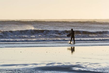 Surfing in the cold pacific waters of the Oregon coast as the sun sets casting a strong backlight adding a glow on the mist and moisture in the air