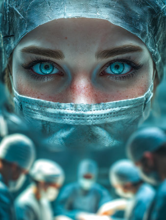 A female surgeon demonstrates unwavering concentration amid sterile surroundings, illuminated by clinical lighting, capturing the precision and dedication essential in critica