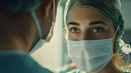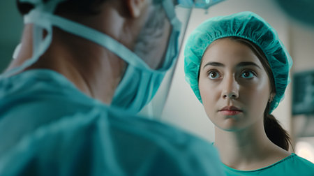 A 30-year-old nurse looking at her male colleague while they are working in an operation room. Generated by artificial intelligence.