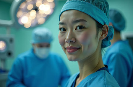 A smiling female surgeon in a well-lit operating room, preparing for surgery, wearing scrubs and gloves, exuding confidence.