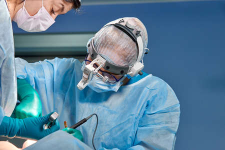 Close up portrait of doctor performing surgery operation in sterile surgery room.
