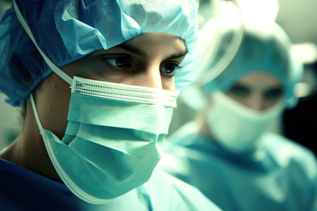 A close-up of a focused surgeon wearing a surgical mask, preparing for surgery in a modern operating room. The image conveys professionalism, healthcare, and medical precision.