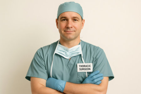 Confident thoracic surgeon stands with arms crossed, wearing scrubs, surgical mask, and a name tag in a close up portrait