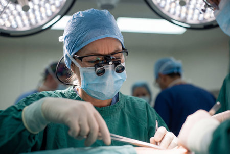 A focused female surgeon wearing medical scrubs, a mask, and surgical loupes performs a complex procedure in a bright operating room with other medical staff