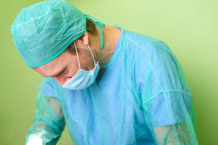 Close up portrait of doctor performing surgery operation in sterile surgery room.